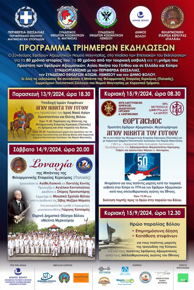 Τριήμερο πολιτιστικών και θρησκευτικών εκδηλώσεων προγραμματίζει ο Σύνδεσμος Εφέδρων Αξιωματικών Ν. Μαγνησίας, στο πλαίσιο εορτασμού του Προστάτη του Μεγαλομάρτυρα Αγίου Νικήτα του Γότθου και της Ημέρας Τιμής & Μνήμης του Εφέδρου Αξιωματικού στις 15/9.