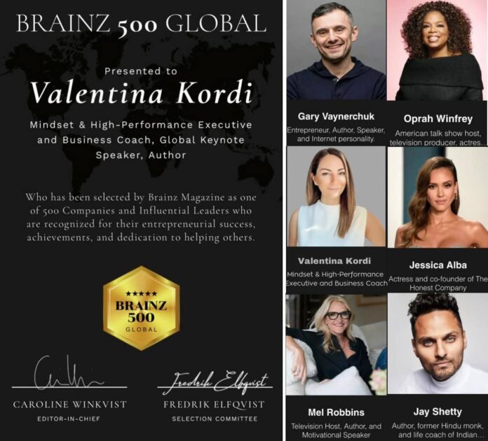 Είναι Ελληνίδα, Βολιώτισσα και μόλις λίγο πριν «εκπνεύσει» το 2021 λαμβάνει το βραβείο 𝗕𝗿𝗮𝗶𝗻𝘇 𝟱𝟬𝟬 𝗚𝗹𝗼𝗯𝗮𝗹 του διεθνούς online περιοδικού «Brainz Magazine». Δεν είναι άλλη από την καταξιωμένη Προπονήτρια Τρόπου Σκέψης και Υψηλής Απόδοσης και Διεθνή Ομιλήτρια, Βαλεντίνα Κόρδη. Η «ΜΑΓΝΗΣΙΑ» επικοινώνησε μαζί με τη συμπολίτισσά της, η οποία μεταξύ άλλων νιώθει τιμή που το όνομά της βρίσκεται στη λίστα με τις 500 Επιχειρήσεις και τους Leaders, οι οποίοι αναγνωρίζονται για την επιχειρηματική τους επιτυχία, τα επιτεύγματα και την αφοσίωσή τους να βοηθούν τους συνανθρώπους τους.