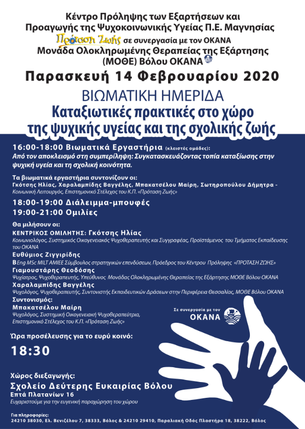 Βιωματική ημερίδα με θέμα “Καταξιωτικές πρακτικές στο χώρο της ψυχικής υγείας και της σχολικής ζωής” πραγματοποιείται την Παρασκευή 14 Φεβρουαρίου στις 16:00 στο Σχολείο Δεύτερης Ευκαιρίας Βόλου- Επτά Πλατανίων 16- από την Πρόταση Ζωής και τον Οκανά. Η προσέλευση του κοινού θα γίνεται από τις 18.30 καθώς νωρίτερα θα λάβουν χώρα κλειστές ομάδες βιωματικών εργαστηρίων.