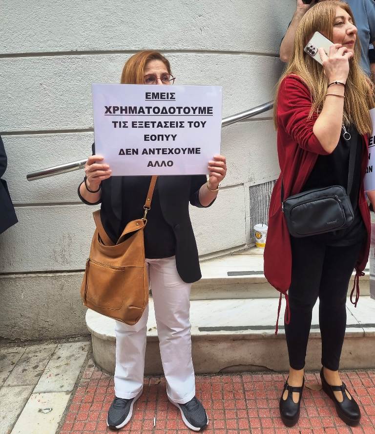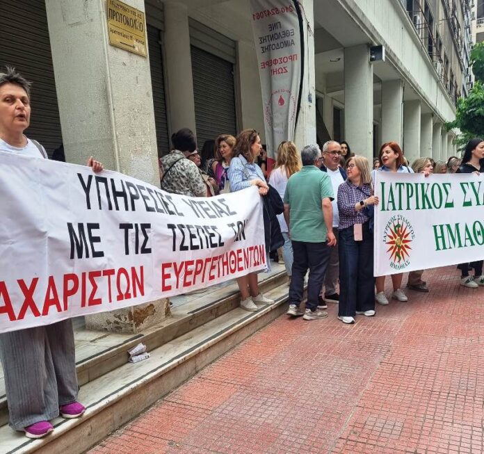 Πραγματοποιήθηκε σήμερα η συγκέντρωση εργαστηριακών γιατρών στο Υπουργείο Υγείας, την ώρα που αντιπροσωπεία τους είχε συνάντηση με τον υπουργό Άδωνι Γεωργιάδη, για να συζητήσουν τη λύση των προβλημάτων τους.