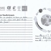 Αξιότιμε κύριε Πρωθυπουργέ, πρέπει να προσέχουμε τα δάση. Να μην καίγονται και να μην τα κόβουμε. Στο δάσος μένει ο λύκος και άλλα ζωάκια που πρέπει να τα προσέχουμε. Το καλοκαίρι κάηκε πολύ μεγάλο δάσος στης Ελένης το σπίτι. Πρέπει να προσέχουμε, γιατί τα ζωάκια φοβούνται και κλαίνε», έγραψε ο Δημήτρης 4 ετών.