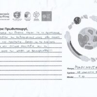 Πολυγραφότατη η Ολυμπία 4 ετών γράφει «1. Να τοποθετηθούν κάδοι σκουπιδιών και ανακύκλωσης στο προαύλιο του σχολείου μας. 2. Να πέσουν οι τιμές του αερίου και του πετρελαίου έτσι ώστε οι πολίτες να μην αναγκάζονται να καίνε ξύλα για να ζεσταθούν. Έτσι θα μειωθεί η υλοτόμηση και η μόλυνση της ατμόσφαιρας. 3. Να μεταφερθούν τα εργοστάσια της ΑΓΕΤ και της Χαλυβουργίας εκτός πόλης, καθώς και το εργοστάσιο ανακύκλωσης πλαστικών».