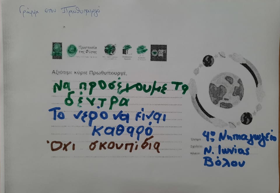 4ο Νηπιαγωγείο Ν. Ιωνίας : «Αξιότιμε κύριε Πρωθυπουργέ, να προσέχουμε τα δέντρα, το νερό να είναι καθαρό, όχι σκουπίδια» έγραψαν οι μικτοί λιλιπούτειοι μαθητές του 4ου Νηπιαγωγείου Ν. Ιωνίας περνώντας ένα ουσιαστικό περιβαλλοντικό μήνυμα σε λίγες μόνο λέξεις. Μάλιστα, η κάρτα που στάλθηκε στον Πρωθυπουργό ήταν γραμμένη από τα ίδια τα παιδιά. Δεν είναι άλλωστε τυχαίο το γεγονός ότι οι μικροί μαθητές γνωρίζουν για το περιβάλλον, καθώς το σχολείο βραβεύτηκε με τη σημαία του προγράμματος “Αειφόρο Ελληνικό Σχολείο: όλοι νοιαζόμαστε, όλοι συμμετέχουμε” για την προσπάθεια μετασχηματισμού του σε αειφόρο σχολείο!