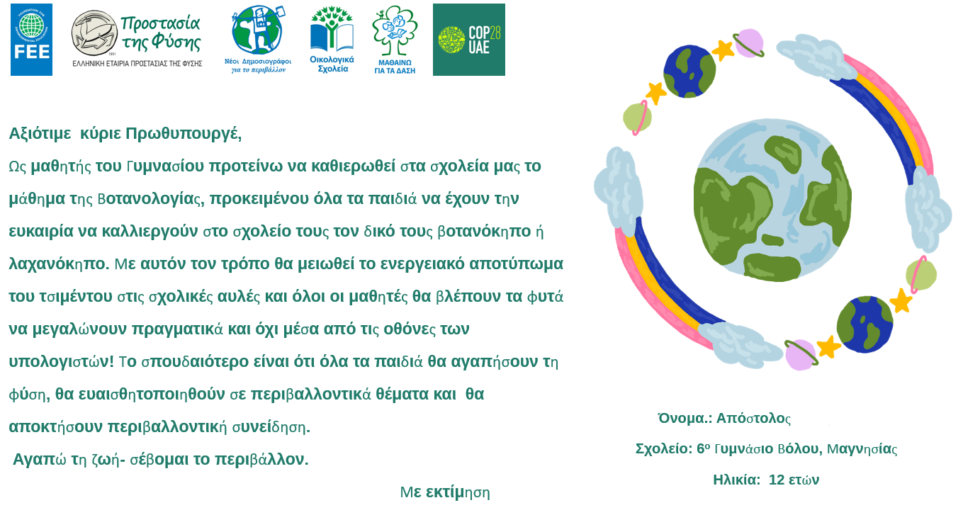 Ο Απόστολος, 12 ετών αναφέρεται στο μήνυμά του στο τι μπορεί να γίνει στα σχολεία για την ανάπτυξη της οικολογικής συνείδησης και γράφει στον πρωθυπουργό «Αξιότιμε κύριε Πρωθυπουργέ,