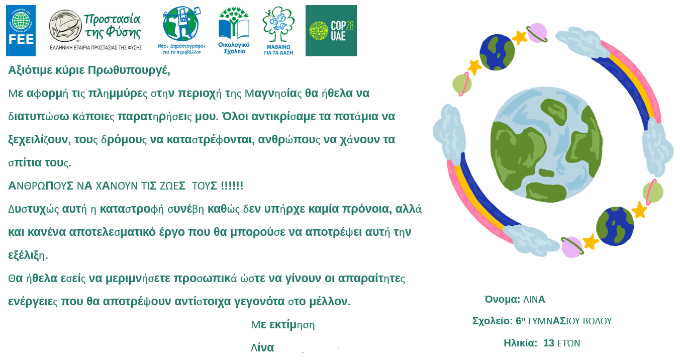 Η 13χρονη Λίνα από την πλευρά της με σταθερό λόγο και πολύ ουσιαστικό στέλνει μήνυμα στον Πρωθυπουργό με επίκεντρο τις πλημμύρες στη Μαγνησία. Ειδικότερα, γράφει «Αξιότιμε κύριε Πρωθυπουργέ, Με αφορμή τις πλημμύρες στην περιοχή της Μαγνησίας θα ήθελα να διατυπώσω κάποιες παρατηρήσεις μου. Όλοι αντικρίσαμε τα ποτάμια να ξεχειλίζουν, τους δρόμους να καταστρέφονται, ανθρώπους να χάνουν τα σπίτια τους.