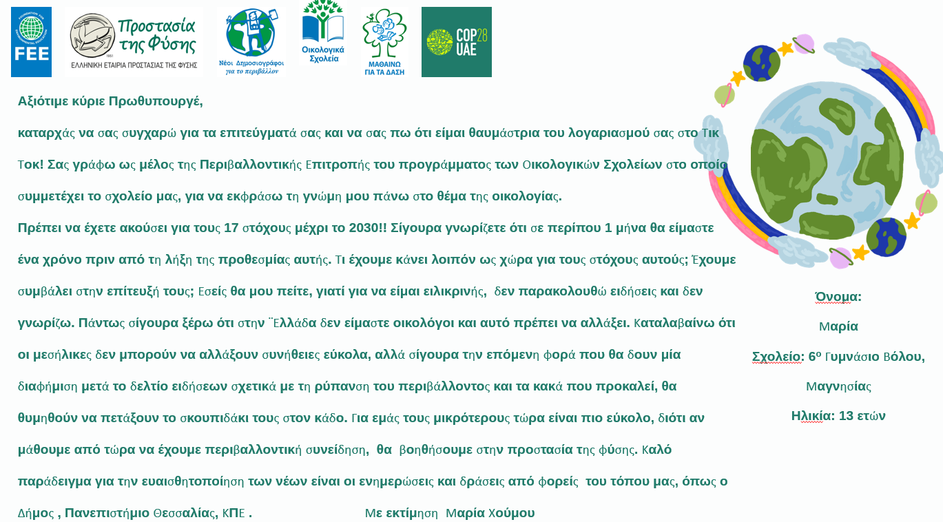 6ο Γυμνάσιο Βόλου: «Αξιότιμε κύριε Πρωθυπουργέ, καταρχάς να σας συγχαρώ για τα επιτεύγματά σας και να σας πω ότι είμαι θαυμάστρια του λογαριασμού σας στο Τικ Τοκ! Σας γράφω ως μέλος της Περιβαλλοντικής Επιτροπής του προγράμματος των Οικολογικών Σχολείων στο οποίο συμμετέχει το σχολείο μας, για να εκφράσω τη γνώμη μου πάνω στο θέμα της οικολογίας.
