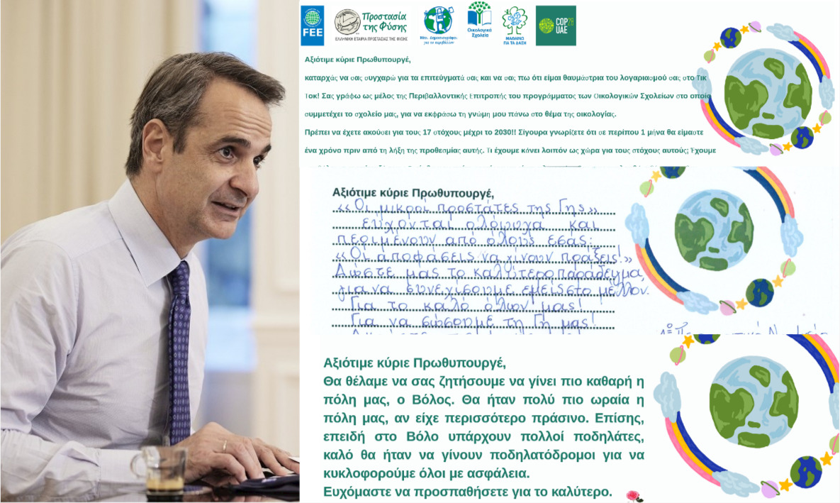 Βολιώτες μαθητές από τις πρώτες τάξεις του νηπιαγωγείο έως και το Γυμνάσιο έστειλαν τα δικά τους ξεχωριστά μηνύματα στον Πρωθυπουργό Κυριάκο Μητσοτάκη για την προστασία του περιβάλλοντος, στο πλαίσιο δράσης που πραγματοποιήθηκε πανελλαδικά από την Ελληνική Εταιρεία Προστασίας της Φύσης. Οι μικροί μαθητές με δημιουργικότητα και ευφάνταστο τρόπο συμβούλευσαν και πολλές φορές προέτρεψαν τον Πρωθυπουργό να δώσει μεγαλύτερη βαρύτητα στο περιβάλλον.