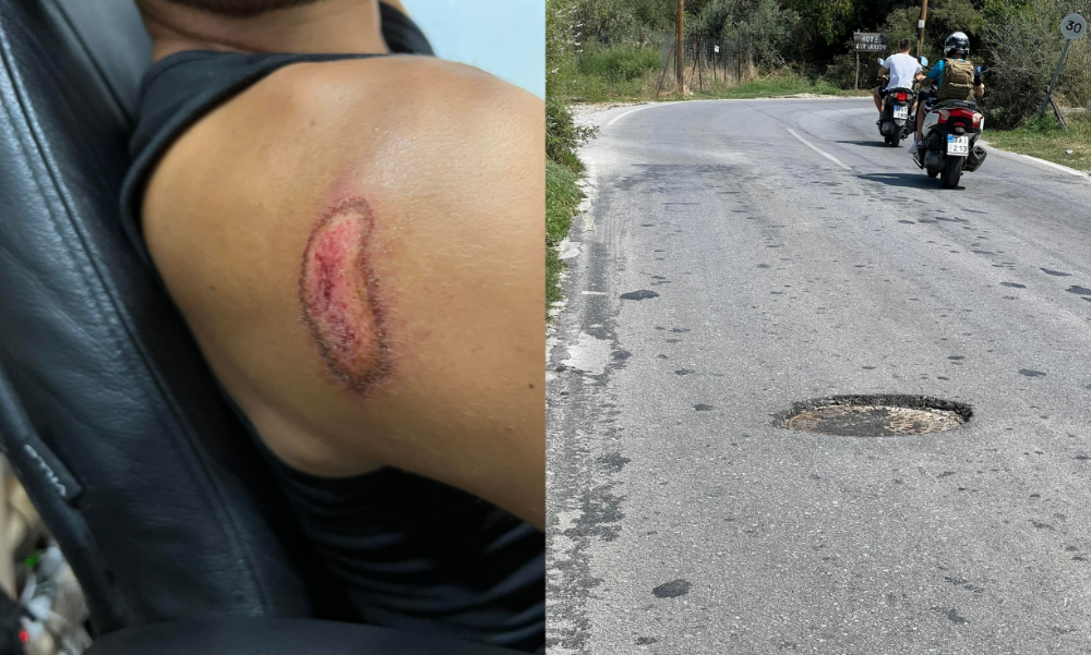 Και ρωτάω αν κατεβαίνει ένα μηχανάκι που δεν ξέρει, ένα ποδήλατο που το οδηγεί ένας μεσήλικας ή ένα παιδί μιας και λίγο πιο δίπλα έχει πάρκο και πέσει μέσα μη έχοντας την εμπειρία που έχω τι θα γίνει;» γράφει χαρακτηριστικά ο παθών, ο οποίος τραυματίστηκε στα χέρια, τα πόδια αλλά και το πρόσωπο από την πτώση εξαιτίας της λακκούβας.