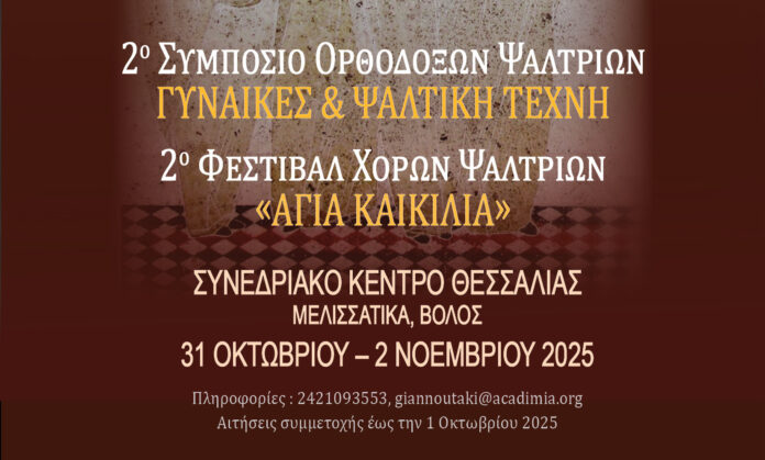 Το 2ο Διεθνές Συμπόσιο Ψαλτριών Ορθόδοξου ανατολικού μέλους και το 2ο Φεστιβάλ Χορών Ψαλτριών «Αγία Καικιλία» θα πραγματοποιηθούν στον Βόλο, το τριήμερο από 31 Οκτωβρίου έως 2 Νοεμβρίου.