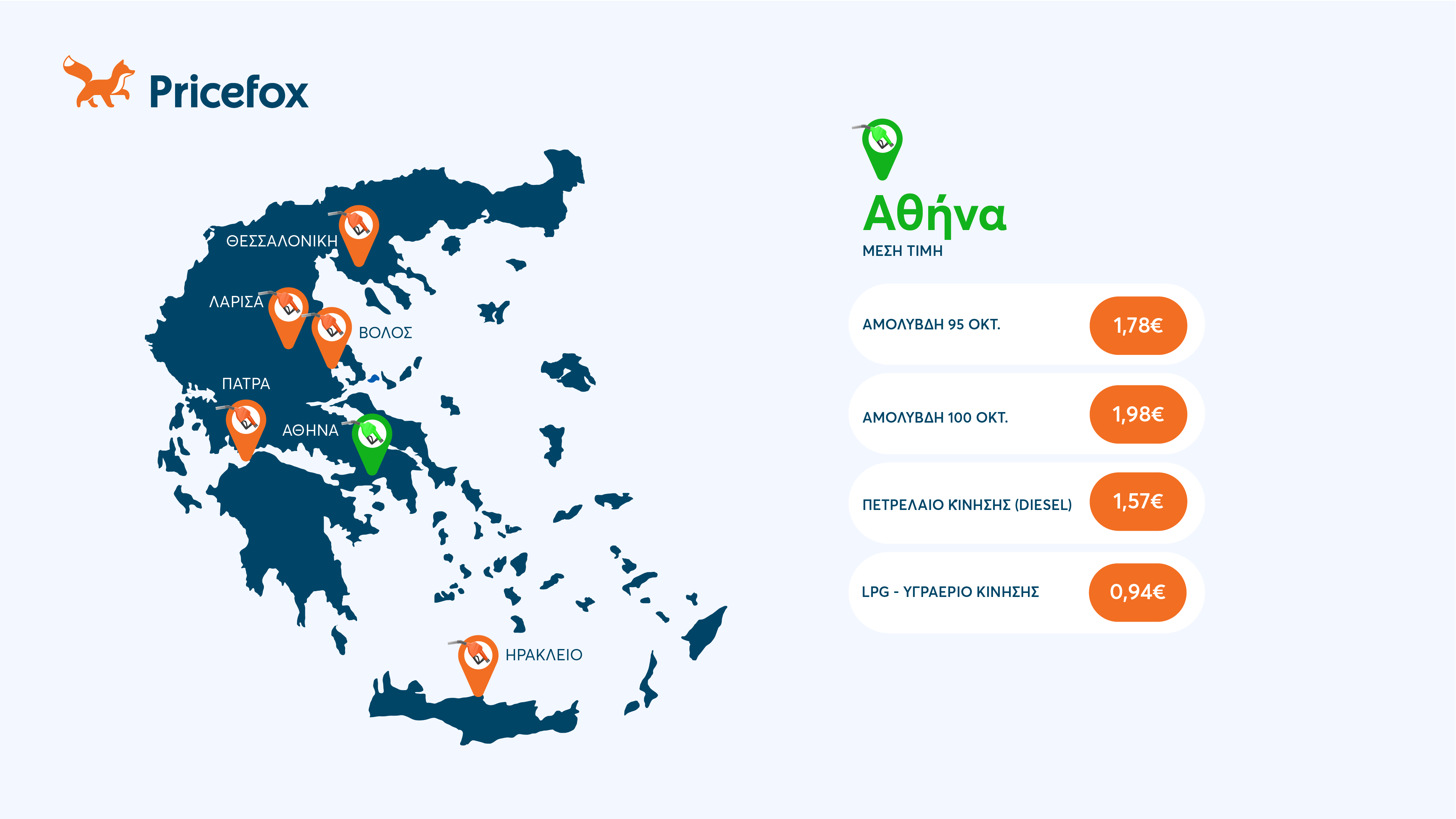 Η απλή αμόλυβδη διαμορφώνεται γύρω στα 1,75 €/λ, περίπου 0,03 €/λ φθηνότερα από πέρσι και ελαφρώς κάτω από τον πανελλαδικό μέσο όρο.