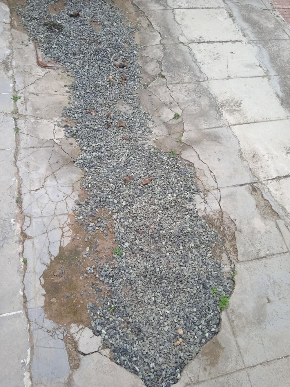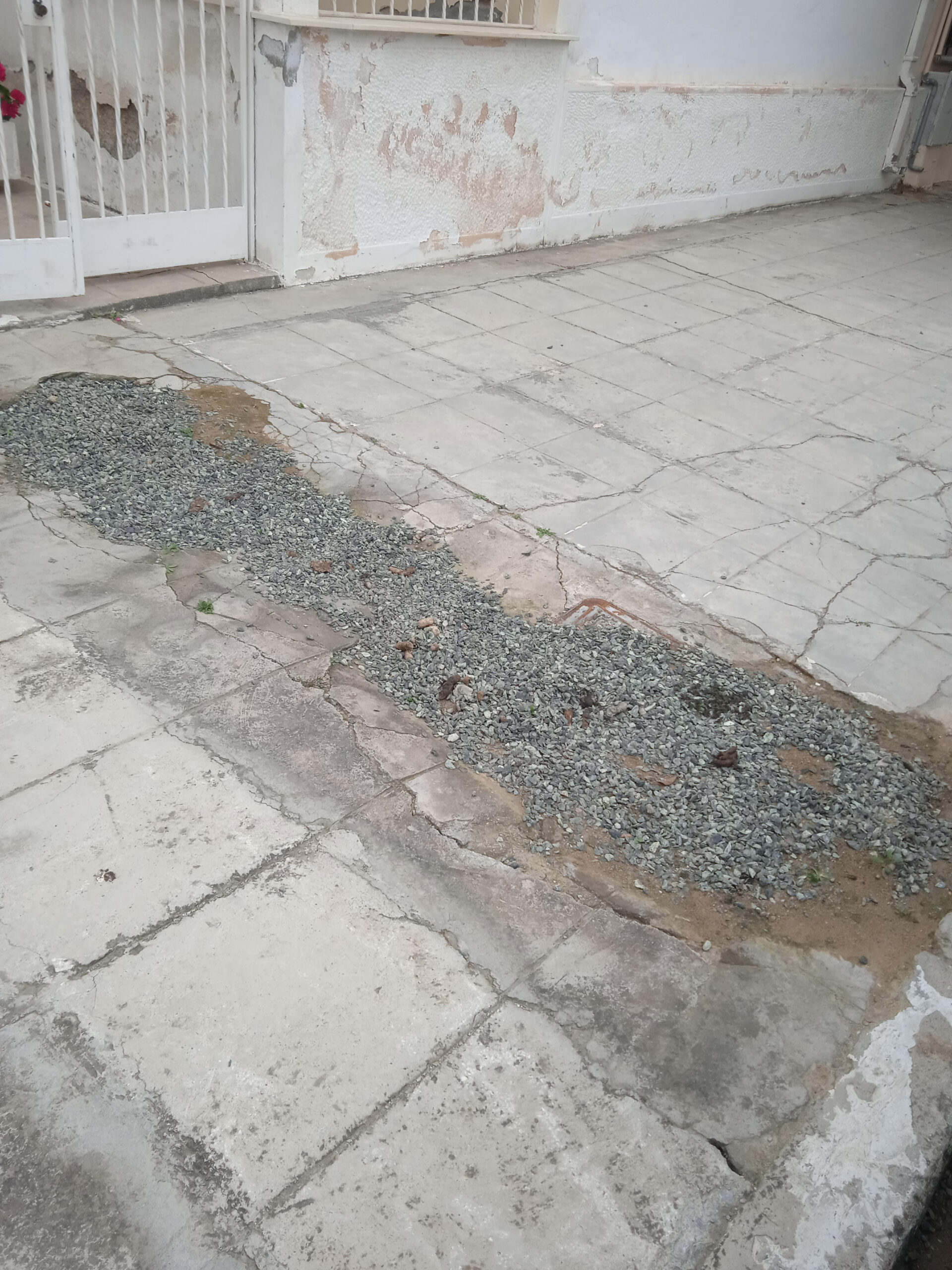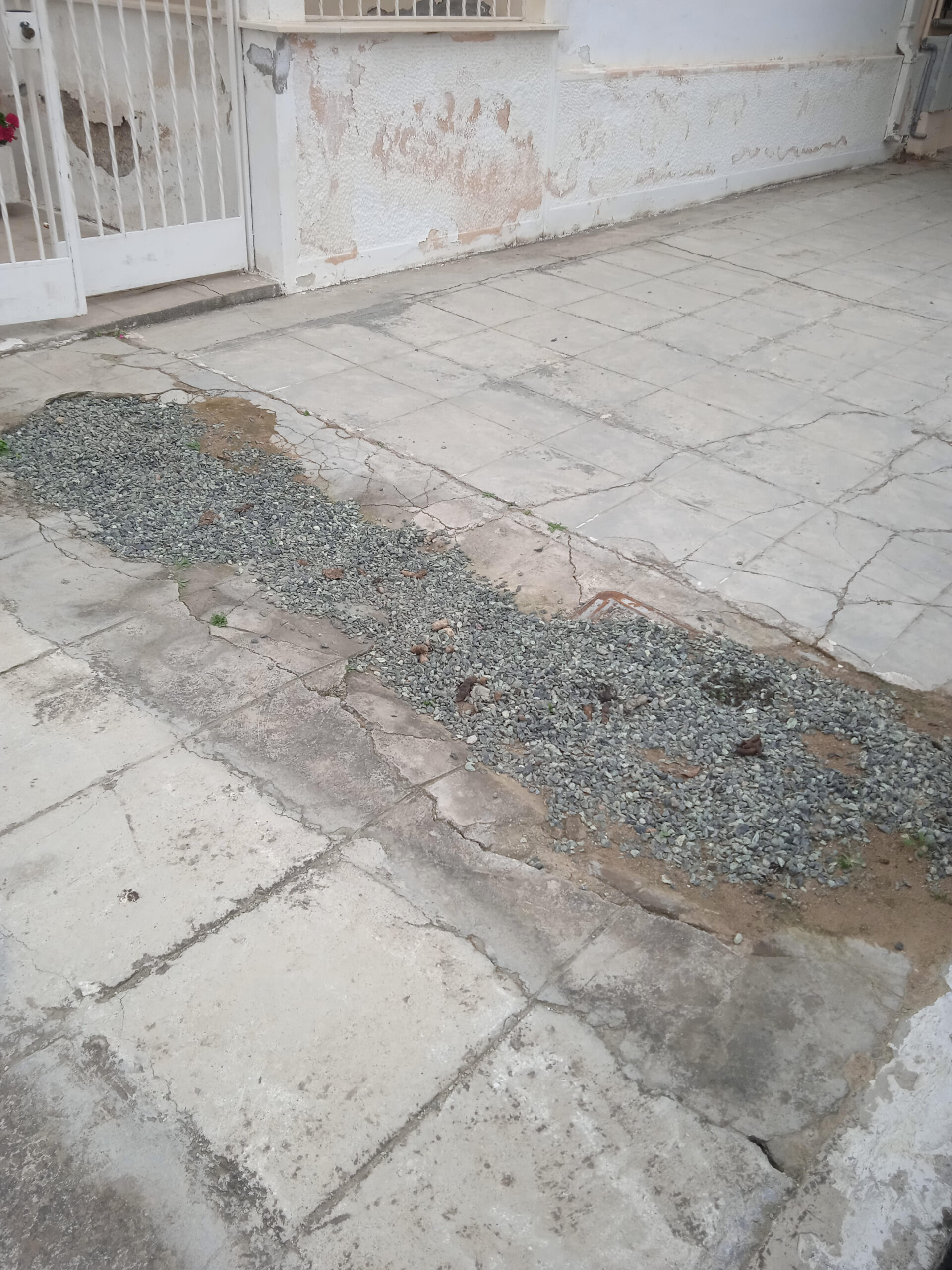 Πρόχειρα με χαλίκι καλύφθηκε η λακκούβα που υπάρχει σχεδόν δύο χρόνια στο πεζοδρόμιο στην οδό Δημάρχου Γεωργιάδου 18.