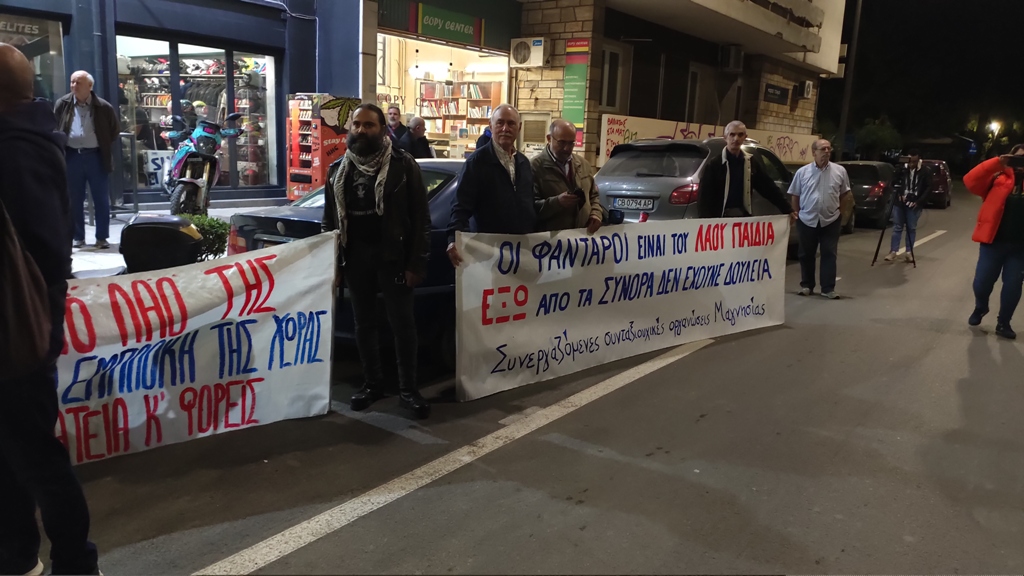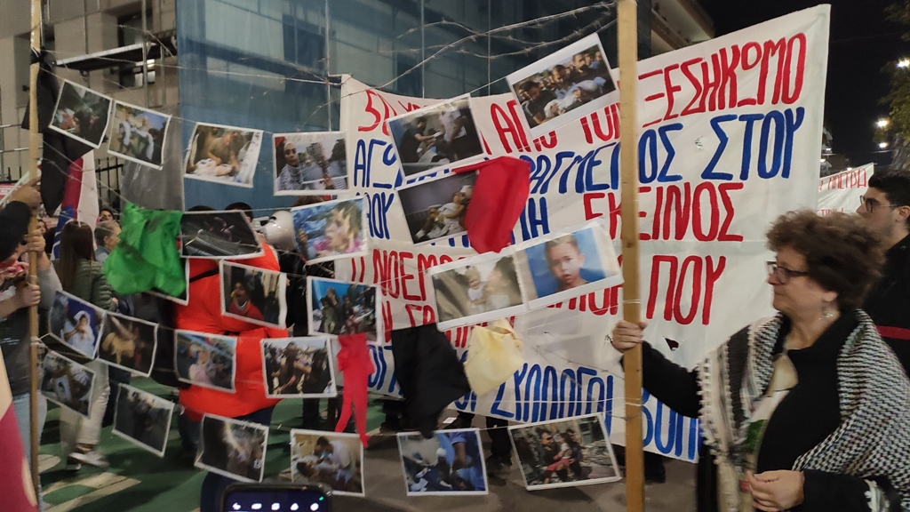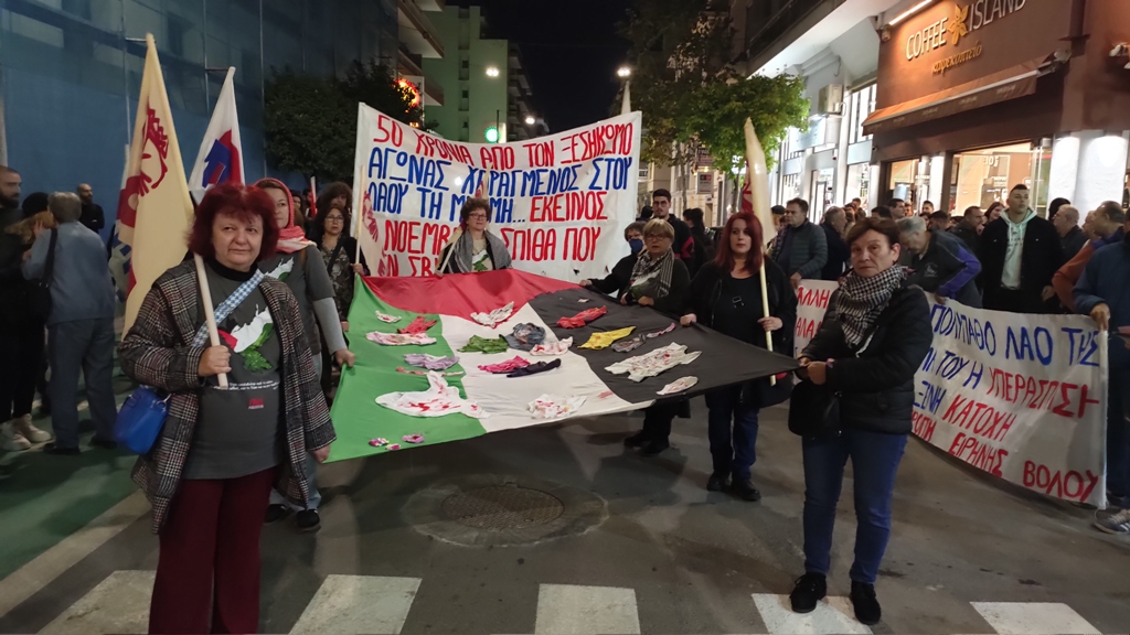 Στην κεφαλή της οποίας βρέθηκαν μέλη της Επιτροπής Ειρήνης που κρατούσαν την σημαία της Παλαιστίνης με παιδιά αιματοβαμμένα ρούχα, ενώ σωματεία, συνταξιούχοι και διαδηλωτές του ΠΑΜΕ συνέχισαν στην οδό Δημητριάδος με κατεύθυνση προς το στρατόπεδο «Γεωργούλα».