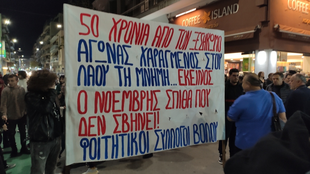 Μαζική, δυναμική και ειρηνική ήταν η συγκέντρωση, για δεύτερη φορά φέτος, του συνόλου των φοιτητικών συλλόγων, κομμάτων, συλλογικοτήτων, φορέων και σωματείων σήμερα το απόγευμα στον Θόλο του Πανεπιστημίου Θεσσαλίας, για την 50η επέτειο της εξέγερσης του Πολυτεχνείου και της αποκατάστασης της Δημοκρατίας. Το μήνυμα ήταν υπέρ του λαού του Παλαιστίνης.