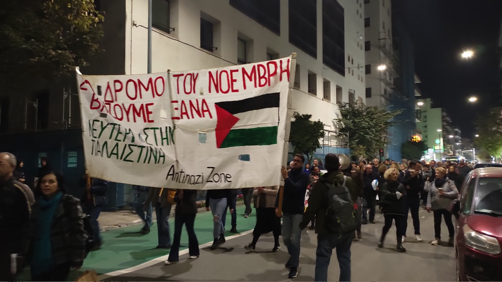Στην πορεία ακούστηκαν συνθήματα, υπέρ της εξέγερσης του Πολυτεχνείου και κατά της εισβολής του Ισραήλ στην Παλαιστίνη.
