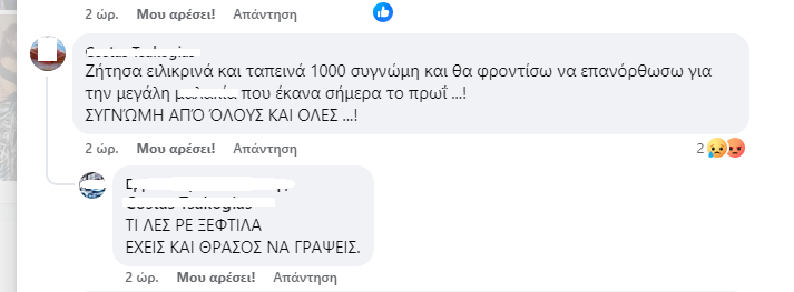 Τα σχόλια κάτω από την ανάρτηση του επιχειρηματία ήταν πολλά, με τους διαδικτυακούς του φίλους να σημειώνουν ότι ο δράστης είχε μεγάλο θράσος. Ωστόσο κανείς δεν περίμενε ότι ένα από τα σχόλια θα ήταν και αυτό …του ίδιου του δράστη! Ο κλέφτης δηλαδή μπήκε στο facebook και παραδέχτηκε την πράξη του, ζήτησε συγνώμη και είπε πως θα βρει τρόπο να επανορθώσει με τον Βολιώτη επιχειρηματία να εκρήγνυται από την απάντηση αυτή γράφοντας χαρακτηριστικά «έχεις θράσος να γράψεις».
