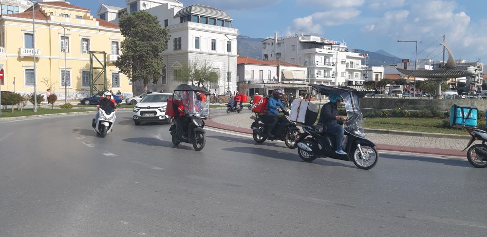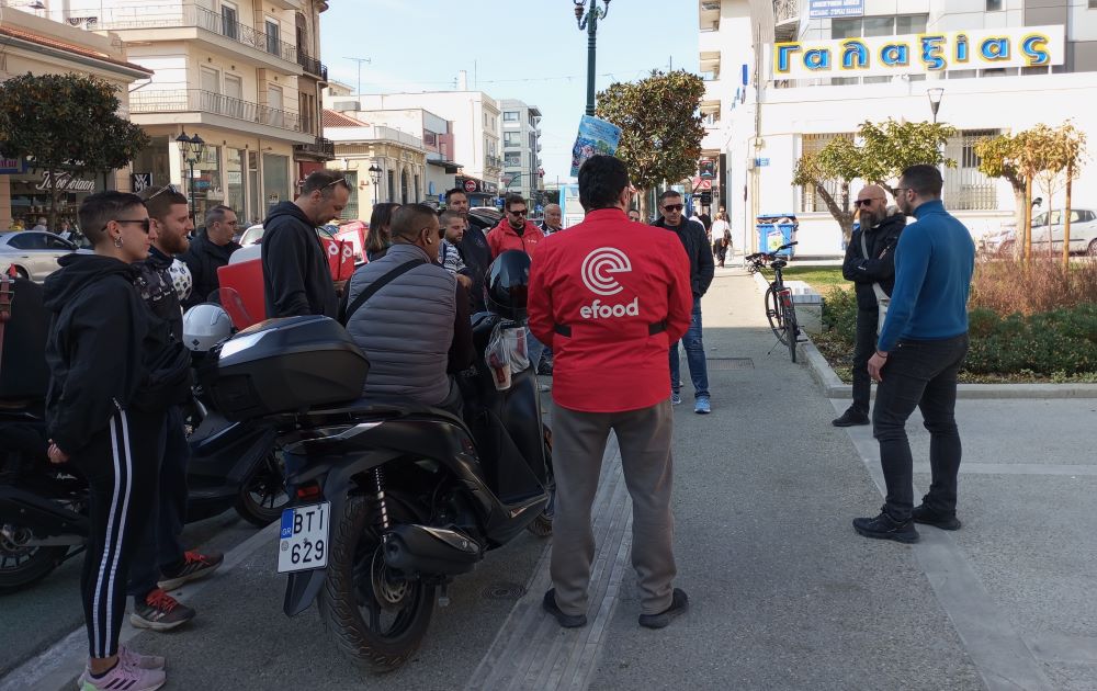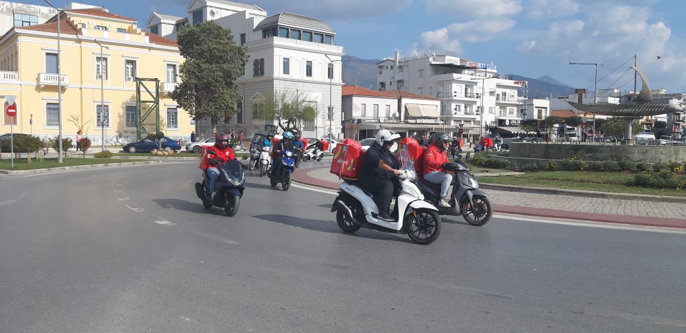 Γύρω στη 1 το μεσημέρι οι διανομείς πραγματοποίησαν πορεία με τα μηχανάκια τους στους κεντρικούς δρόμους του Βόλου.