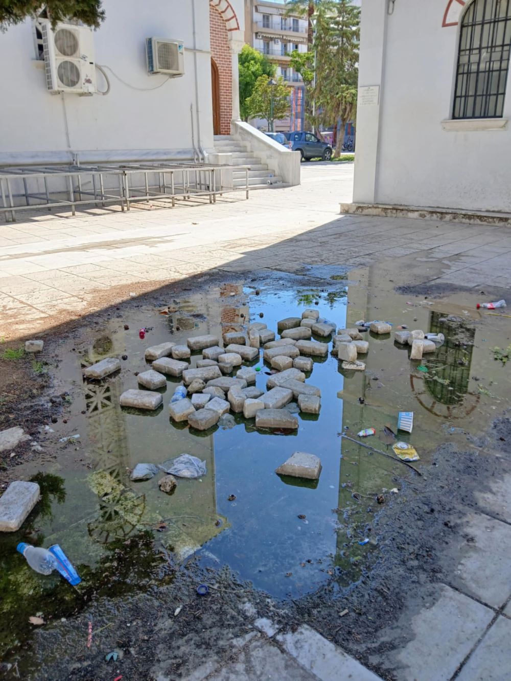 Εκτός από τα σκουπίδια που υπάρχουν, το νερό που λιμνάζει δημιουργεί μια άσχημη εικόνα, με τους διερχόμενους να την επισημαίνουν κάθε φορά που διασχίζουν τον περίβολο του ναού.