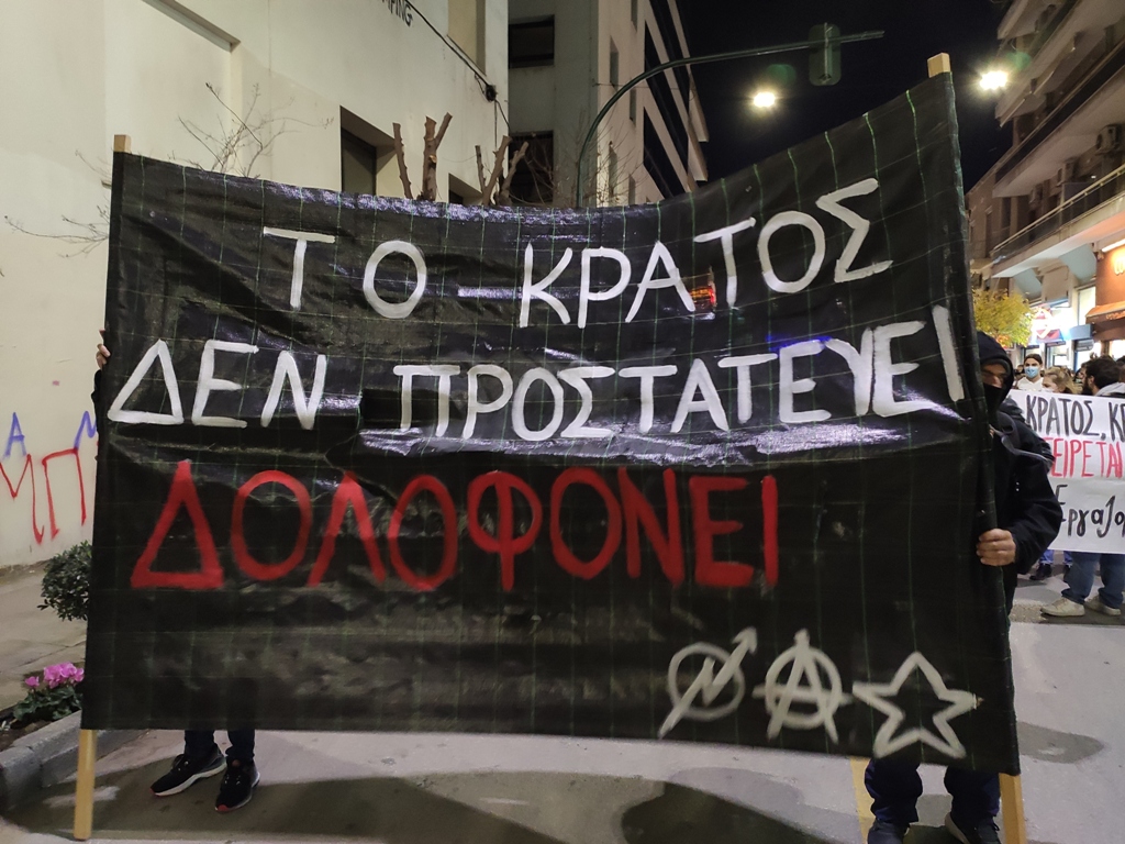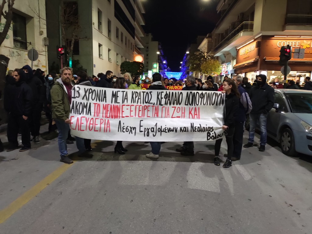 Η πορεία ξεκίνησε λίγο μετά τις 7 το απόγευμα, με συνθήματα κατά της κρατικής βίας και της Αστυνομία σ’ όλη τη διάρκειά της. Ξεκίνησε από τον Θόλο, κατευθύνθηκε δια των οδών Δημητριάδος και Κ. Καρτάλη, στην Περιφερειακή Ενότητα Μαγνησίας, στη συνέχεια κατέβηκε την οδό Ελ. Βενιζέλου και κατέληξε στην Πλατεία Πανεπιστημίου, όπου οι συγκεντρωμένοι έμειναν μέχρι και μετά τις 8.30 το απόγευμα, οπότε και διαλύθηκαν.