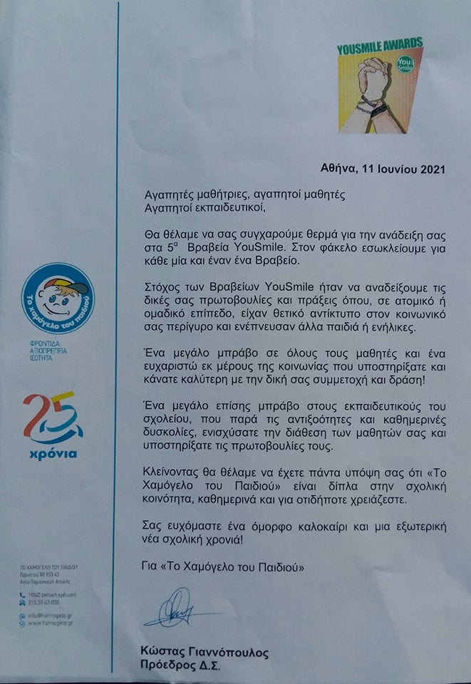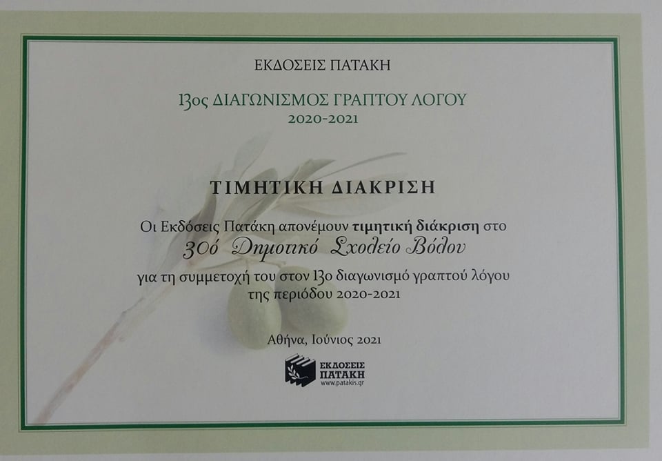 Στο παραπάνω πλαίσιο κατά την περσινή χρονιά πραγματοποιήθηκαν μια σειρά από δράσεις ακόμη και στην περίοδο της τηλεκπαίδευσης. Το σχολείο συμμετείχε στο μαθηματικό διαγωνισμό για μαθητές/τριες Ε’- Στ’ Δημοτικού, στον Πανελλήνιο διαγωνισμό συγγραφής των Εκδόσεων Πατάκη, στη δράσηYouSmile από το Χαμόγελο του Παιδιού με στόχο τη συγκέντρωση πράξεων και πρωτοβουλιών μαθητών/τριών, όπου, σε ατομικό επίπεδο ή ομαδικό επίπεδο , είχαν θετικό αντίκτυπο στον κοινωνικό περίγυρο κι ενέπνευσαν είτε άλλα παιδιά ή ενήλικες.