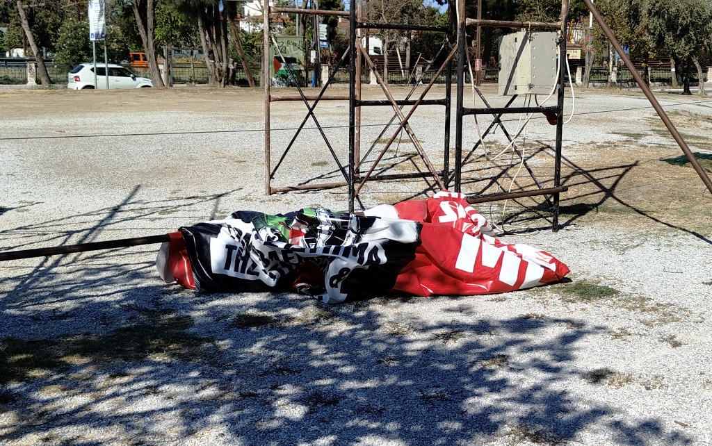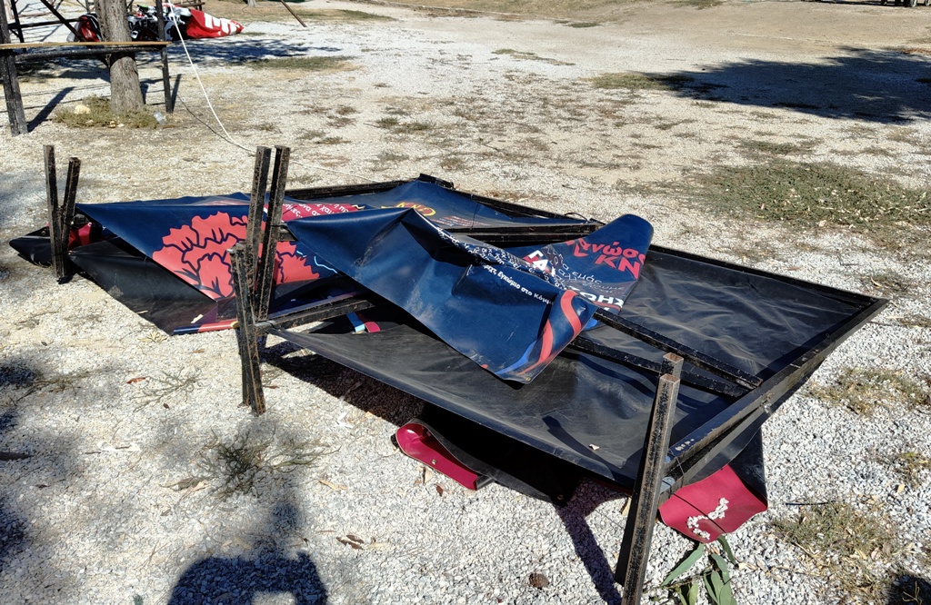 Από τον δυνατό αέρα που φυσούσε τη νύχτα και συνεχίζει σήμερα το πρωί, στο χώρο που θα γίνει το φεστιβάλ έγιναν ζημιές σε μπάνερ που στράβωσαν, ενώ ευτυχώς, δεν είχαν στηθεί ακόμη οι καρέκλες.