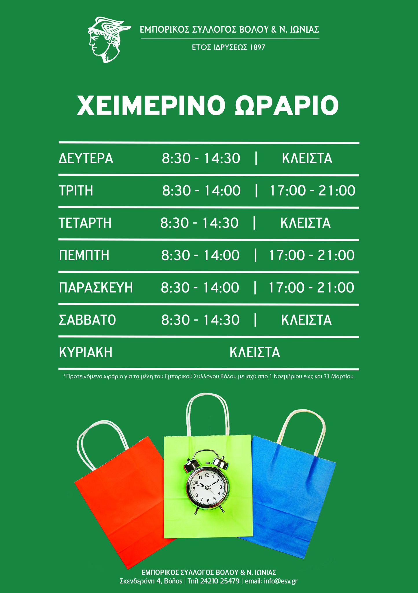 Με την ευκαιρία της αλλαγής αυτής και ενόψει της χειμερινής περιόδου, από το Σάββατο 1 Νοεμβρίου 2025 έως και την Τρίτη 31 Μαρτίου 2026, προτείνεται σε ισχύ το χειμερινό ωράριο λειτουργίας των εμπορικών καταστημάτων- μελών του Ε.Σ.Βόλου.