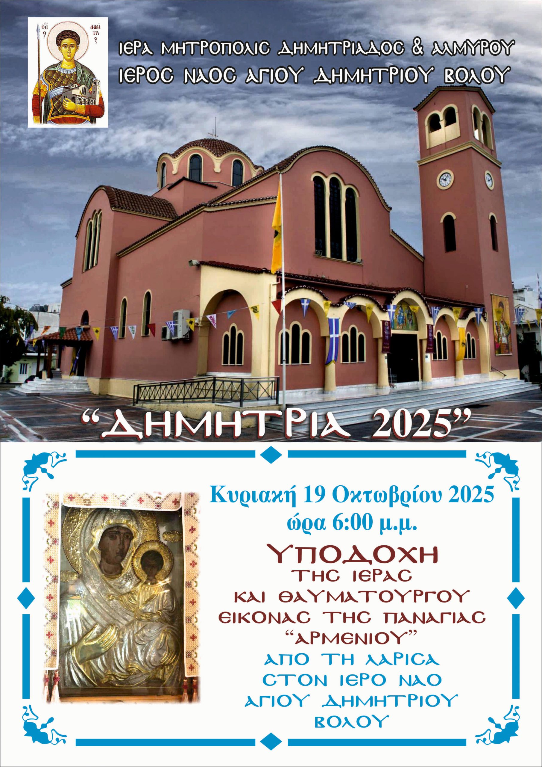 Με την υποδοχή της Ιεράς και Θαυματουργού Εικόνας της Παναγίας “Αρμενίου”, η οποία φυλάσσεται στο Ιερό Παρεκκλήσιο της Παναγίας της Αρμενιώτισσας, στο Αρμένιο Λαρίσης, ανοίγει την Κυριακή 19 Οκτωβρίου η αυλαία των «Δημητρίων 2025», της εβδομάδος λατρευτικών εκδηλώσεως της ομώνυμης ενορίας της Νέας Δημητριάδας, επί τη εορτή του Αγίου Μεγαλομάρτυρος Δημητρίου του Μυροβλύτου.