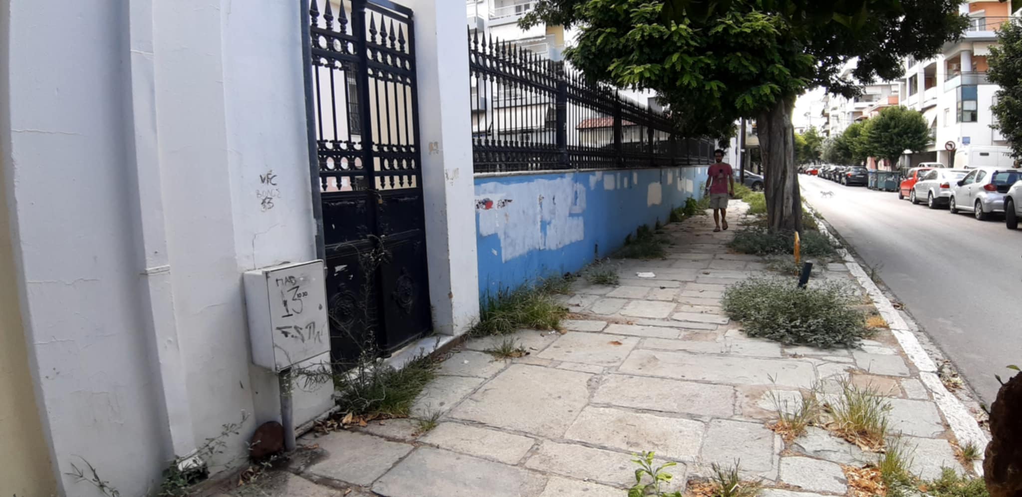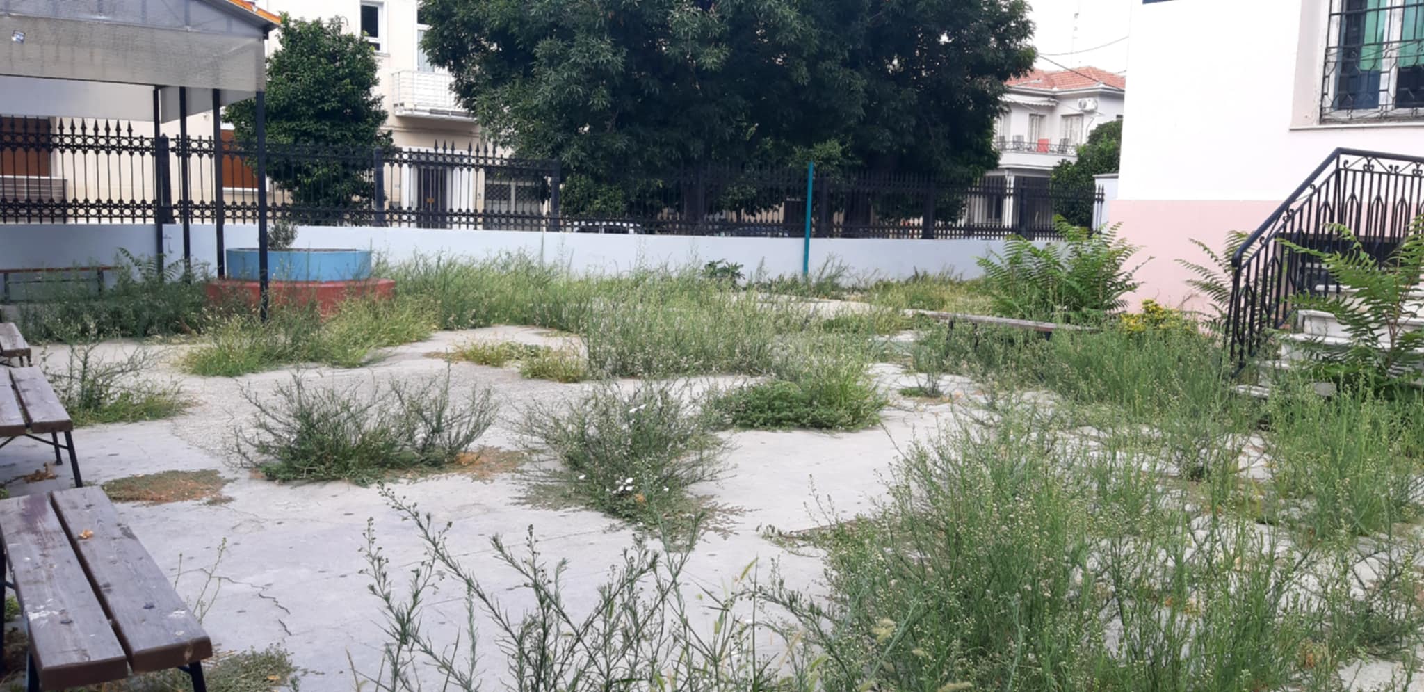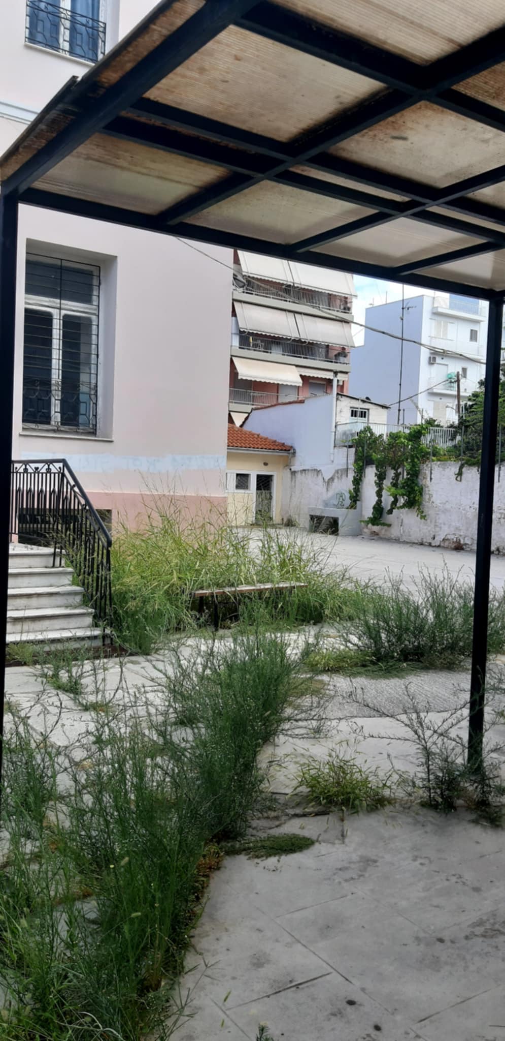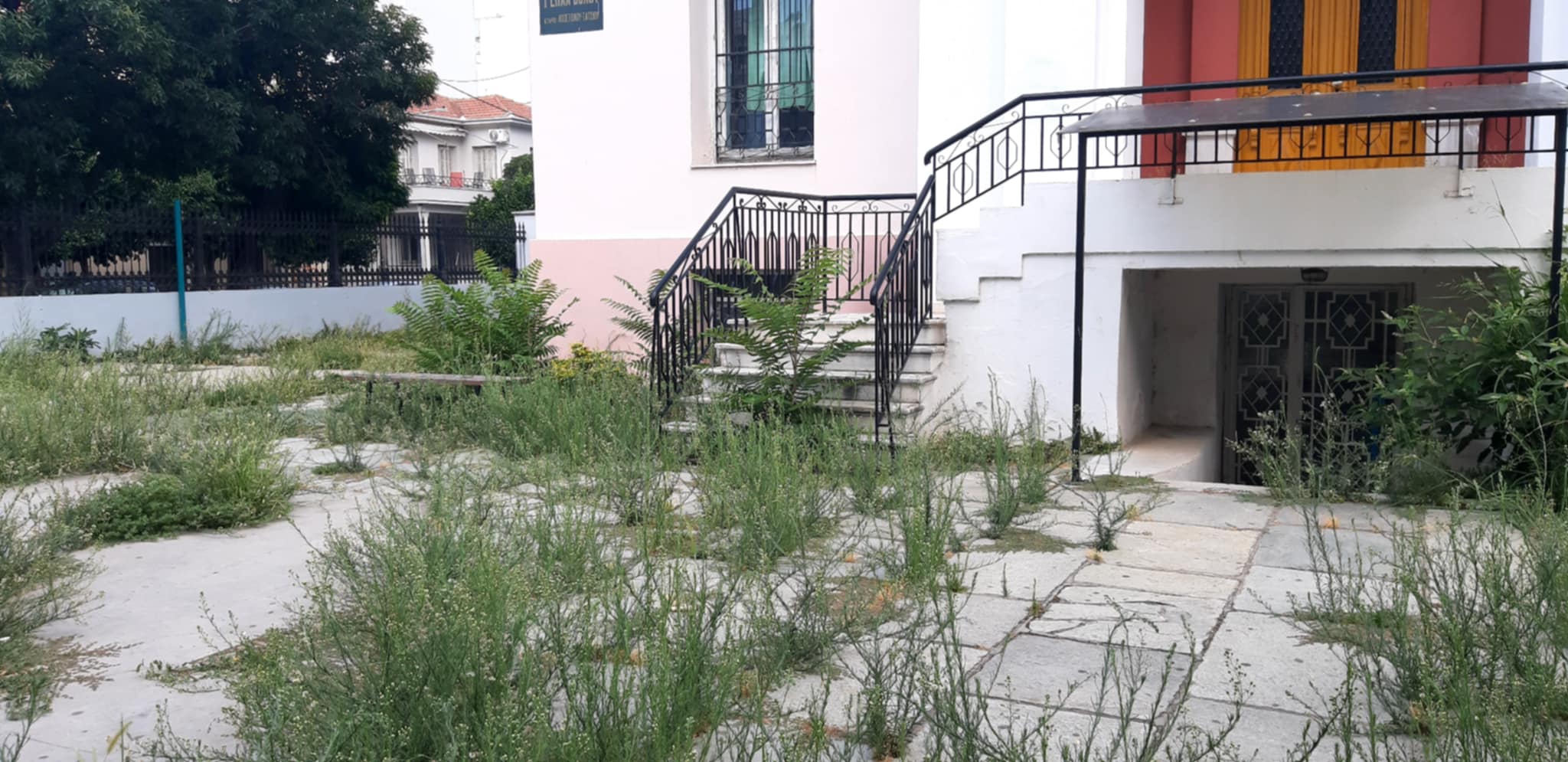 Η πρώτη εικόνα, που αντικρύζει κανείς περνώντας από το 1ο ΕΠΑΛ Βόλου, το οποίο βρίσκεται στην καρδιά της πόλης, είναι η ζούγκλα, με τα χόρτα να κατακλύζουν τα πεζοδρόμια μπροστά στο κτήριο αλλά και μέσα στον προαύλιο χώρο.