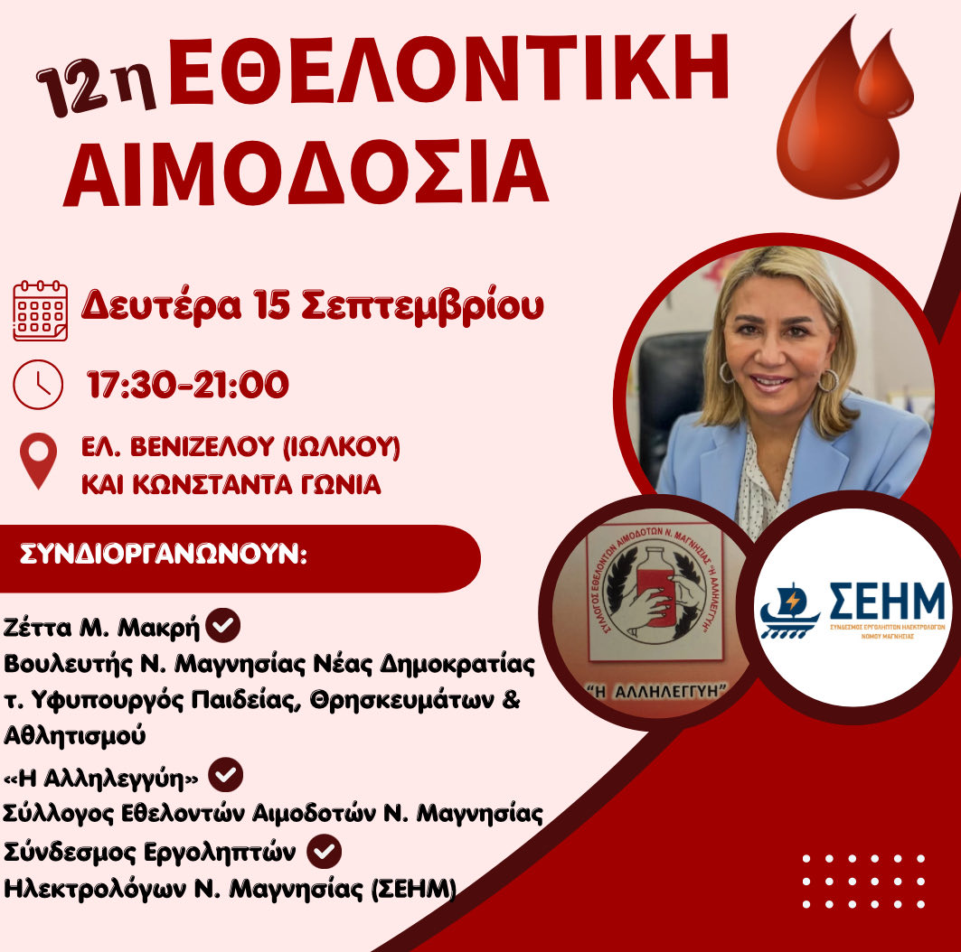 Πρόκειται για τακτική δράση του Συνδέσμου Εργοληπτών Ηλεκτρολόγων Μαγνησίας με τη συνεργασία του πολιτικού Γραφείου της βουλευτού Μαγνησίας της ΝΔ, τέως Υφυπουργού κ. Ζέττας Μακρή και του Συλλόγου Εθελοντών Αιμοδοτών Μαγνησίας.
