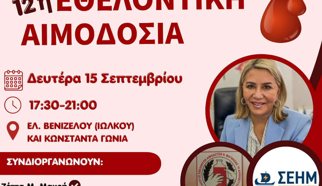 “Η αιμοδοσία είναι πράξη αγάπης και απόδειξη κοινωνικής ευαισθησίας. Τα αποτελέσματα της σώζουν ζωές, διότι το αίμα ούτε παράγεται, ούτε αντικαθίσταται. Μόνο χαρίζεται», αναφέρει ο πρόεδρος του ΣΕΗΜ και Α’ Αντιπρόεδρος του Επιμελητηρίου Μαγνησίας κ. Σερ. Μαουσίδης, απευθύνοντας ανοιχτή πρόσκληση συμμετοχής στην σημερινή δράση εθελοντικής αιμοδοσίας, από τις 5.30 μ.μ. ως τις 9 μ.μ. στη συμβολή των οδών Ιωλκού με Κωνσταντά.