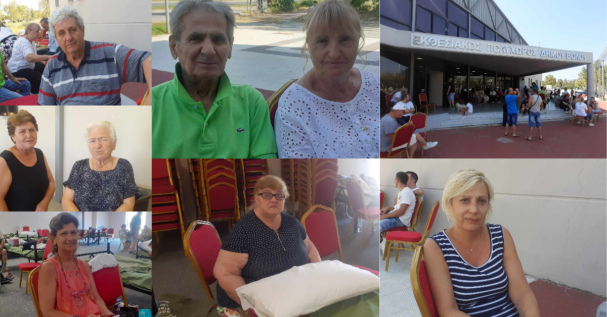 «Ήμουν ξαπλωμένη στο σπίτι και κοντέψαμε να πνιγούμε από τον καπνό. Με την έκρηξη φοβηθήκαμε, άνοιξαν οι τζαμαρίες. Περνούσε η αστυνομία και μας έλεγε να φύγουμε. Ο άνδρας μου έμεινε εκεί. Ο γιός μου, η νύφη μου, τα παιδιά έφυγαν για Βόλο. Εγώ με την ανιψιά μου ήρθαμε στον Βόλο με αυτοκίνητο. Το μυαλό μου ήταν πίσω στον άντρα μου», είπε η ίδια. Δίπλα της η κ. Δήμητρα Γιαννάκη, που άφησε κι εκείνη το σπίτι της και έφτασε στο Εκθεσιακό Κέντρο. Εκεί, της πρότειναν να διανυκτερεύσει σε ξενοδοχείο. Έτσι πέρασε το βράδυ της και το πρωί επανήλθε στο Εκθεσιακό, όπου βρίσκεται στην αναμονή για το εάν και πότε θα επιστρέψει στο σπίτι της.
