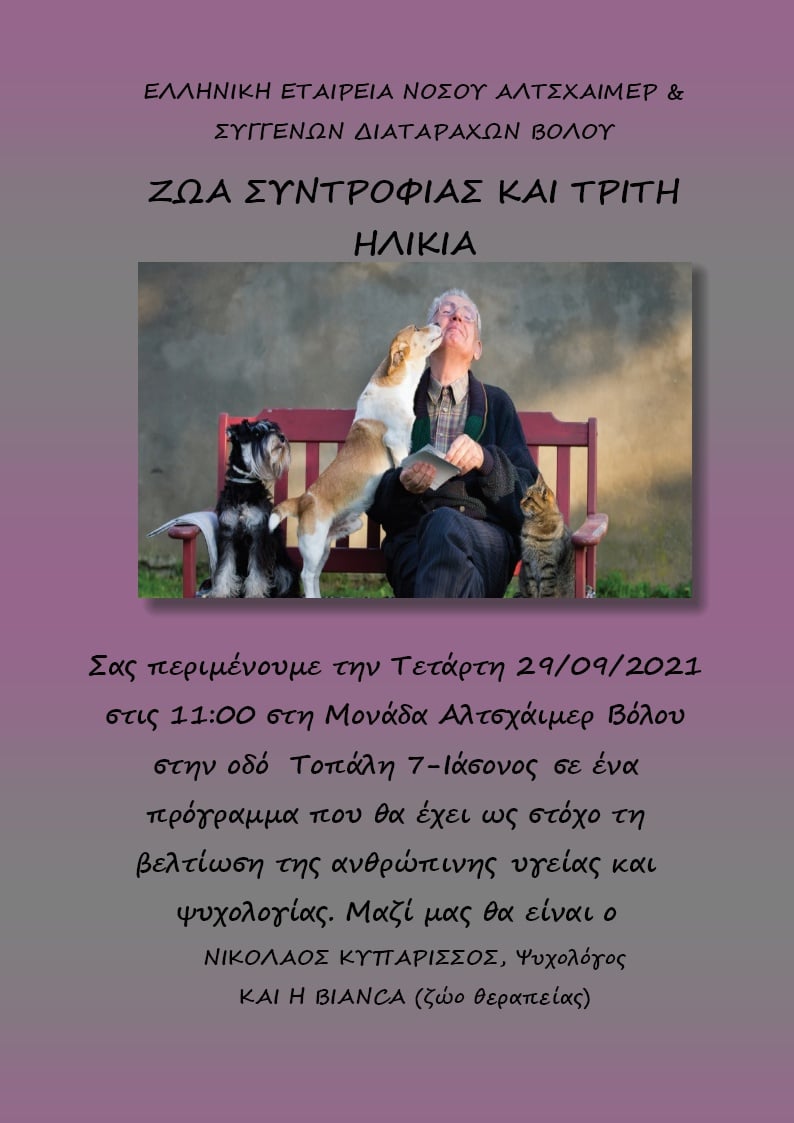 Η Ελληνική Εταιρεία Νόσου Αλτσχάιμερ και Συγγενών Διαταραχών Βόλου διοργανώνει το πρόγραμμα με τίτλο «Ζώα συντροφιάς και τρίτη ηλικία», την Τετάρτη 29 Σεπτεμβρίου στις 11 το πρωί, στη μονάδα Αλτσχάιμερ στην οδό Τοπάλη 7 με Ιάσονος, όπως αναφέρεται σε ανακοίνωση. Στόχος του συγκεκριμένου προγράμματος είναι η βελτίωση της ανθρώπινης υγείας και ψυχολογίας, ενώ συμμετοχή θα έχει ο ψυχολόγος Νικόλαος Κυπαρίσσος και η Bianca, ζώο θεραπείας. Μάλιστα, η Φιλοζωική Ομάδα Βόλου, μέσω ανάρτησής της στο facebook ενημερώνει ότι η Βianca ήταν σκυλί της Φιλοζωικής Ομάδας πριν υιοθετηθεί από τον ψυχολόγο και, όπως χαρακτηριστικά αναφέρει, “καμαρώνουμε γι’ αυτήν».